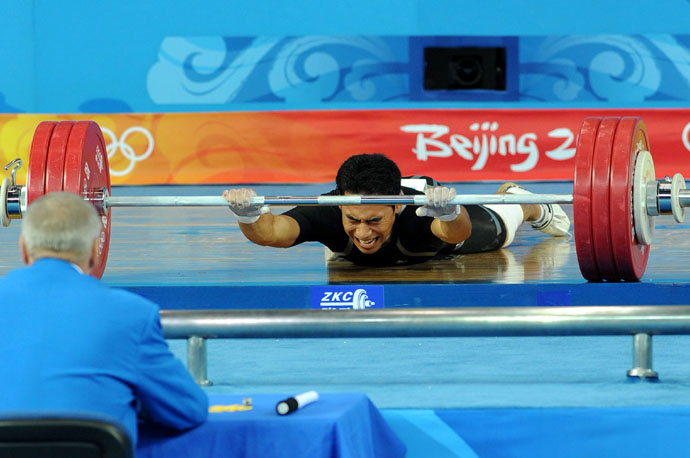 8月12日,雅典奧運(yùn)會男子舉重69公斤級亞軍得主、韓國選手李培永在北京奧運(yùn)會舉重男子69公斤級決賽挺舉比賽中失誤,但仍緊緊抓住杠鈴。李培永在挺舉的三次試舉中,因?yàn)榈谝慌e受傷而導(dǎo)致最后兩舉功敗垂成,與獎牌失之交臂。