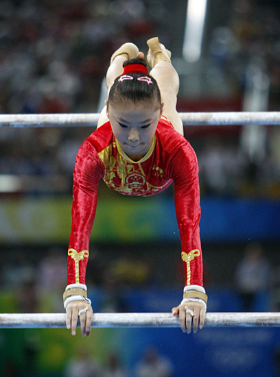 8月18日,中國選手何可欣在高低杠比賽中。當(dāng)日,在國家體育館進(jìn)行的北京奧運(yùn)會(huì)體操高低杠決賽中,何可欣以16.725分的成績(jī)奪得冠軍。