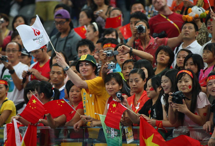 8月18日,觀眾在看臺上為選手加油助威。當日,北京奧運會體操單項決賽和女子蹦床決賽在國家體育館進行。