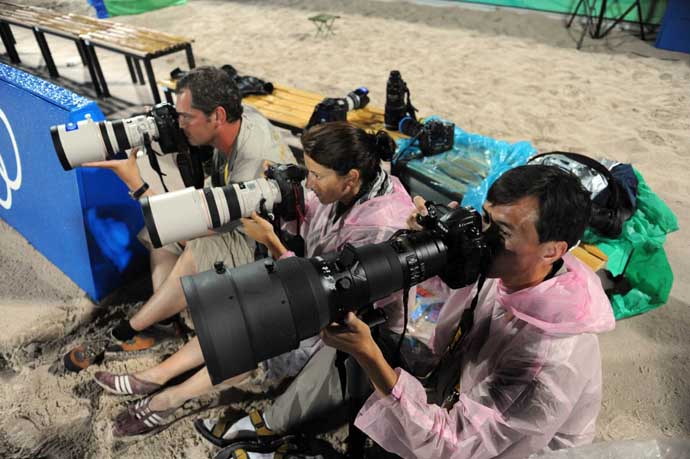 8月18日,新華社哈薩克族攝影記者沙達提在北京沙灘排球場內(nèi)與美聯(lián)社、法新社等多家媒體一起忙碌地處理圖片。