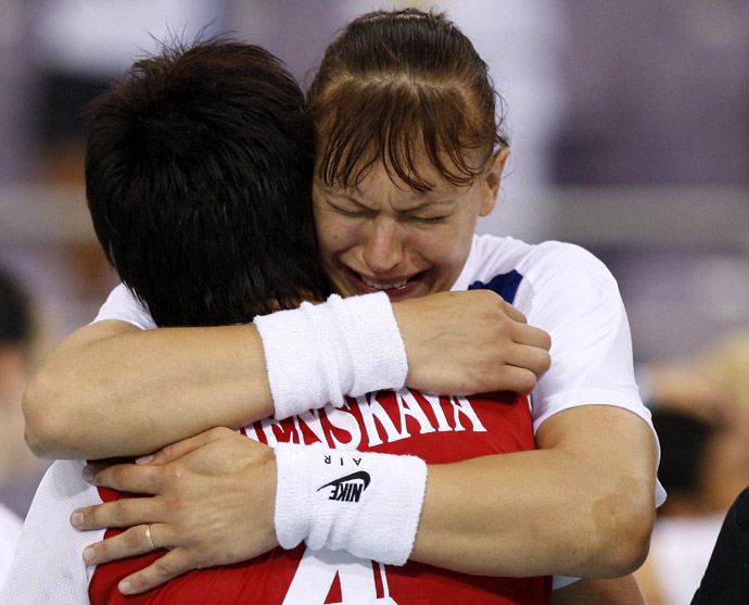 8月19日,俄羅斯隊(duì)球員葉連娜·波列諾娃在賽后喜極而泣。當(dāng)日,在北京奧體中心體育館舉行的北京奧運(yùn)會女子手球四分之一決賽中,經(jīng)過兩場加時(shí)賽,俄羅斯隊(duì)以32比31戰(zhàn)勝法國隊(duì),晉級四強(qiáng)。