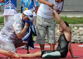 不像室內(nèi)游泳比賽每個(gè)選手都有專門水道,馬拉松游泳選手們沒有屬于自己的賽道,她們擠在一起游泳難免碰手碰腳,搶占優(yōu)勢位置也很有講究。 在20日的女子馬拉松游泳比賽中,很多選手上岸后都在抱怨別人的不是。銅牌得主、英國選手帕滕在水中弄傷了腳,她說:“我身上的每個(gè)部位都疼,水里有一些拉人動(dòng)作!苯鹋频弥鳌⒍砹_斯選手伊利琴科曾與兩位巴西選手并駕齊驅(qū),她說:“這兩個(gè)人太有進(jìn)攻性了,行為舉止接近非體育精神的邊緣,這是游泳,不是拳擊。”