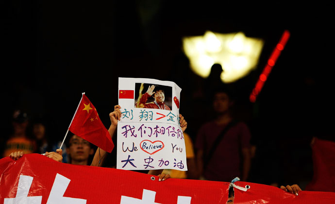 8月20日,北京奧運會田徑比賽在國家體育場“鳥巢”繼續(xù)進行。圖為比賽中觀眾打出的標語。