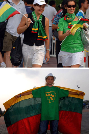 8月20日,立陶宛球迷揮舞國旗為自己的球隊助威(拼版照片)。當日,中國男子籃球隊在北京奧運會男子籃球四分之一決賽中迎戰(zhàn)立陶宛隊。這場比賽吸引了大批中國和立陶宛的球迷觀看,為球員加油助威。