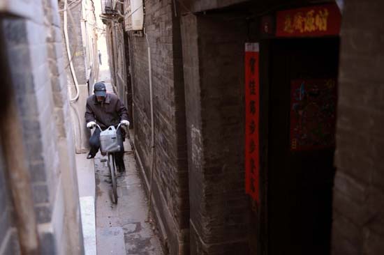 一名騎車人在狹窄的錢市胡同中穿行。本報記者:張領(lǐng)