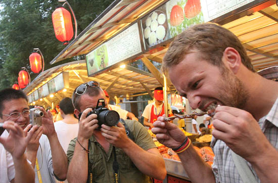 外國游客在北京東華門夜市品嘗中國傳統(tǒng)小吃。新華社發(fā)(陳曉根 攝)