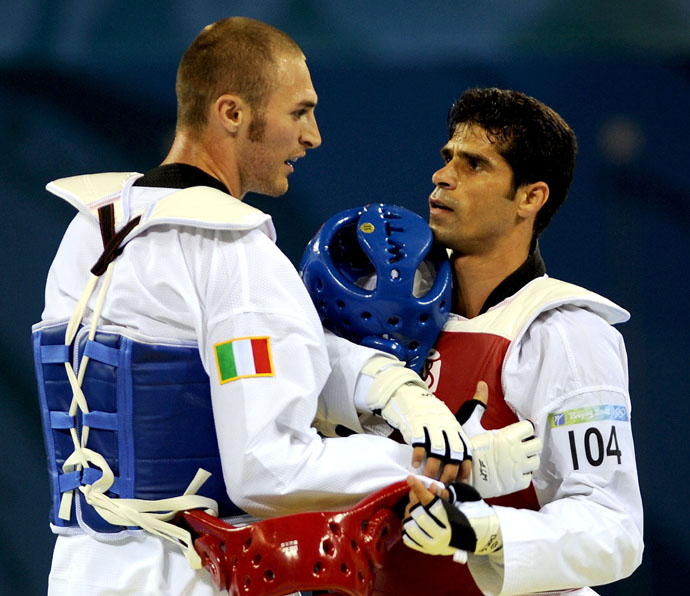 8月22日,伊朗選手薩伊(右)贏得決賽后,與對手意大利選手薩爾米恩托在賽場上交流。