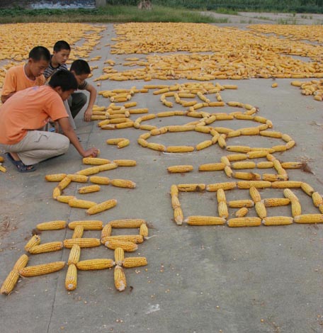 8月23日,江蘇省海安縣大公鎮(zhèn)的幾名農(nóng)村兒童在曬場上,用正在晾曬的玉米棒擺出“奧運加油”、“中國必勝”等字樣和奧運五環(huán)圖案,以此表達(dá)對北京奧運會的祝福。