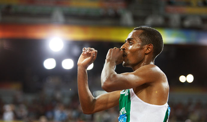 8月23日,埃塞俄比亞選手克內(nèi)尼薩·貝耶查在比賽后慶祝。當(dāng)日,貝耶查在北京奧運(yùn)會男子5000米決賽中以12分57秒82的成績奪得金牌并打破奧運(yùn)會紀(jì)錄。