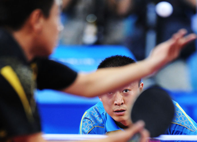 8月23日,中國選手馬琳準(zhǔn)備接對(duì)方的發(fā)球。當(dāng)日,馬琳在北京奧運(yùn)會(huì)乒乓球男子單打決賽中以4比1戰(zhàn)勝隊(duì)友王皓,獲得金牌。