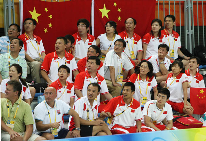 8月23日,坐在觀眾席為隊(duì)友助威的中國(guó)跳水隊(duì)隊(duì)員和教練員等待裁判為周呂鑫的最后一跳打分。當(dāng)日,周呂鑫在北京奧運(yùn)會(huì)跳水男子10米跳臺(tái)決賽中以4.80分之差惜敗澳大利亞選手馬修·米查姆獲得銀牌,止住了中國(guó)跳水橫掃8金的勢(shì)頭。