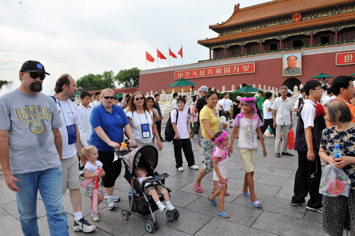 8月23日,幾位外國游客在天安門城樓前游覽。隨著北京奧運會即將結束,大批外國人來到天安門廣場參觀游覽。