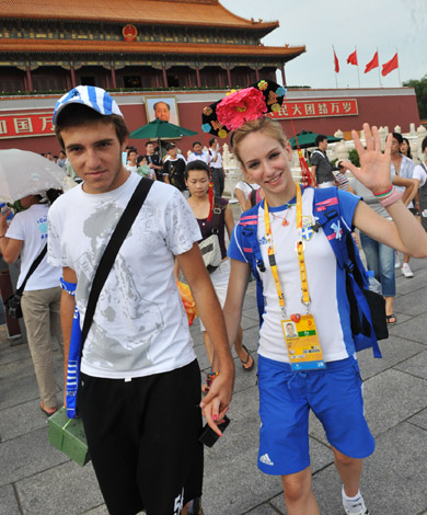 8月23日,兩位外國游客在天安門城樓前游覽。隨著北京奧運會即將結束,大批外國人來到天安門廣場參觀游覽。
