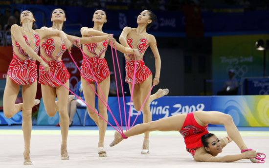 中國藝術(shù)體操新的歷史24日在北京工業(yè)大學(xué)體育館書寫。中國姑娘們在奧運會藝術(shù)體操比賽中,以35.225分歷史性地奪得集體全能銀牌,這也是中國藝術(shù)體操的首枚奧運會獎牌。 實力超群的俄羅斯隊以35.550分奪得金牌,再次包攬奧運會藝術(shù)體操兩金。白俄羅斯隊以34.900分奪得銅牌。 北京奧運會藝術(shù)體操項目設(shè)個人全能和集體全能兩枚金牌。此前,中國藝術(shù)體操的歷史最好成績是亞特蘭大奧運會的第五名。24日的決賽中,中國藝術(shù)體操姑娘們在家門口大放異彩。她們動作編排精美,整體配合默契,在首輪5繩比賽中,就奪得第三名,超過主要競爭對手意大利隊0.575分。 次輪3圈+2棒的比賽中,伴著京劇傳統(tǒng)音樂開場,中國姑娘們時而如飛鳥凌空展翅,時而如孔雀驚艷開屏,甜美的笑容打動了全場觀眾?胺Q完美的表現(xiàn)令中國隊得分超過白俄羅斯隊,一舉奪得集體全能銀牌。看著最終的得分大屏幕,中國藝體姑娘們高興地?fù)肀г谝黄穑蕹梢粓F(tuán)。她們創(chuàng)造了中國藝術(shù)體操新的歷史。 俄羅斯隊在決賽中再次展示了在藝術(shù)體操領(lǐng)域的“霸主”地位。兩輪的全場最高分讓她們再次包攬了北京奧運會藝術(shù)體操的兩枚金牌。這也是從悉尼奧運會開始,俄羅斯隊連續(xù)三屆奧運會實現(xiàn)個人全能和集體全能金牌的包攬。 賽后,中國隊的主力隊員章碩高興地說:“完全沒想到能拿到銀牌。我們創(chuàng)造了中國藝術(shù)體操最輝煌的一刻。為了這一刻,我們奮斗了這么久,吃了很多苦。今天,我們做到了最好。今天,所有付出都得到了回報! 對于奪得亞軍,中國隊教練白梅說:“其實,中國隊的姑娘們訓(xùn)練特別艱苦,每天的訓(xùn)練都是在超越自己。今天的成績也是她們團(tuán)結(jié)一致、一起拼搏的結(jié)果!