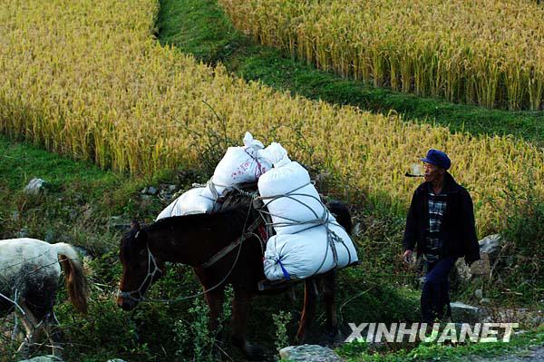 10月7日,貴陽市花溪區(qū)高坡鄉(xiāng)大洪村農(nóng)民運(yùn)送剛收割的稻谷回家。眼下貴陽已進(jìn)入秋糧收割高峰期,農(nóng)民們正利用好天氣加緊搶收稻谷,顆粒歸倉。 |