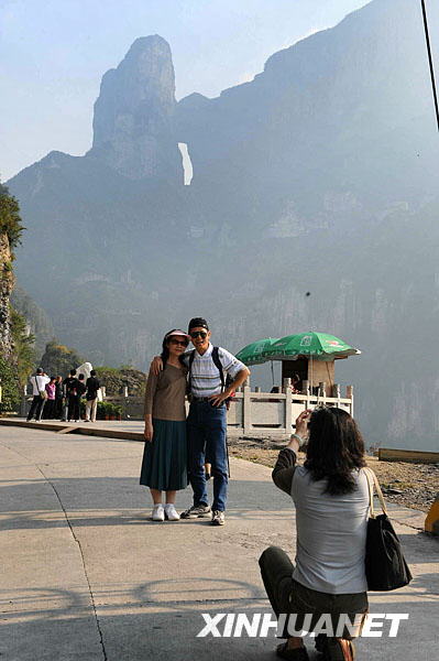 10月16日,游客在張家界天門山國家森林公園的天門洞前合影。