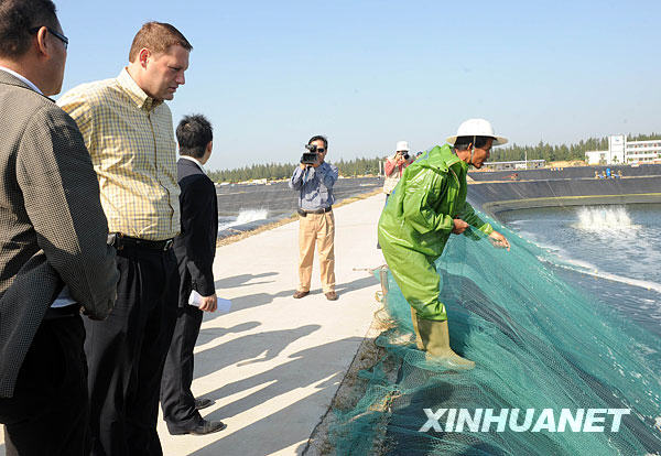 | 11月10日,美國(guó)沃爾瑪集團(tuán)副總裁查理斯·雷德菲爾德(左二)在國(guó)聯(lián)水產(chǎn)公司參觀高位養(yǎng)蝦池。 |  |  |