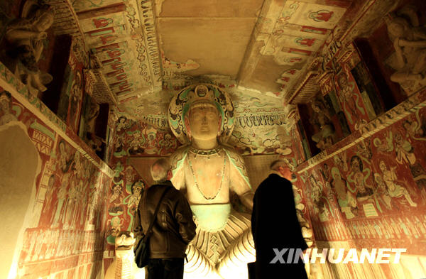 11月18日,參觀者在法國巴黎的中國文化中心觀看立體復(fù)制的敦煌莫高窟第275號(hào)石窟。當(dāng)天,由中國甘肅省敦煌市人民政府、巴黎中國文化中心和吉美博物館聯(lián)合舉辦的“敦煌花雨”藝術(shù)展在巴黎舉行媒體預(yù)展。該展覽將于11月21日正式向公眾開放,并持續(xù)至2009年2月28日。