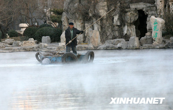 12月22日,濟(jì)南五龍?zhí)丁霸旗F”繚繞。當(dāng)日晨間,由于濟(jì)南市氣溫降至零下10攝氏度以下,趵突泉、黑虎泉、五龍?zhí)兜榷嗵幟霈F(xiàn)“云霧潤蒸”景觀。由于涌出的泉水溫度大大高于氣溫,泉池水面上形成“云霧”。