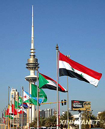 1月18日,阿拉伯國家聯(lián)盟(阿盟)成員國的旗幟在科威特首都科威特城街頭飄揚(yáng)。1月19日至20日,首屆阿拉伯國家經(jīng)濟(jì)峰會將在科威特舉行。