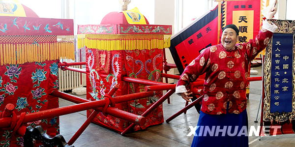2月15日,“京城叫賣大王”臧鴻在展會現(xiàn)場吆喝某參展商推出的“皇家婚禮”。