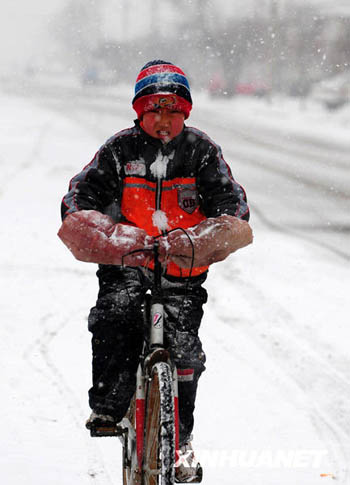 3月11日,一名少年騎車走在鄂爾多斯市杭錦旗獨貴塔拉鎮(zhèn)街頭。當(dāng)日,內(nèi)蒙古自治區(qū)中西部的呼和浩特、包頭、鄂爾多斯、巴彥淖爾等地出現(xiàn)大范圍降雪,氣溫隨之下降。