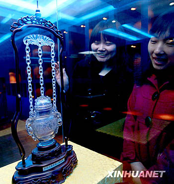 3月19日,兩名游客在圣時(shí)水晶博物館內(nèi)觀賞水晶工藝品。