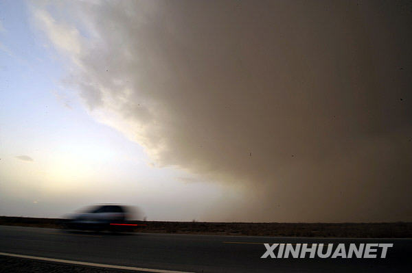 3月26日,一輛轎車在塔里木盆地北緣國道314線上急駛。當(dāng)天日落時分,沙塵天氣突襲新疆塔里木盆地北部,途徑這里的車輛大多開啟車燈緩慢行駛。