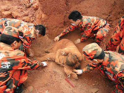 圖為消防官兵在倒塌的土墻下刨出兩名罹難者的遺體。