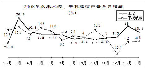 水泥、平板玻璃價(jià)格低位波動(dòng)。3月份,重點(diǎn)建材企業(yè)水泥平均出廠價(jià)為290元/噸,比2月份回落2元/噸,降至2008年4月份水平,同比上漲2元/噸;平板玻璃出廠價(jià)59元/重量箱,比2月份回升1元/重量箱,同比回落10元/重量箱。3月末,重點(diǎn)建材企業(yè)水泥庫(kù)存1226萬(wàn)噸,同比上升19.1%;平板玻璃庫(kù)存2084萬(wàn)重量箱,下降14.6%。