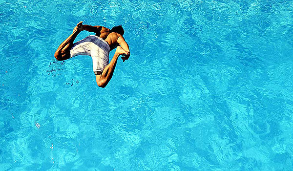 德國不萊梅,一名男子跳進(jìn)泳池避暑。