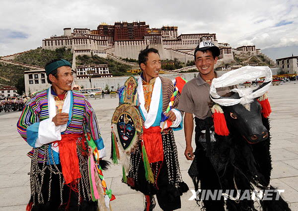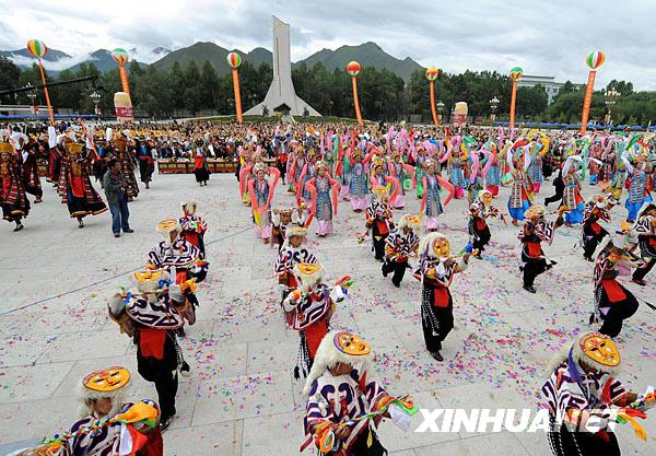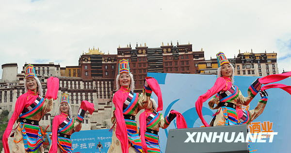 8月20日,人們在拉薩布達(dá)拉宮廣場上表演傳統(tǒng)藏戲及歌舞。