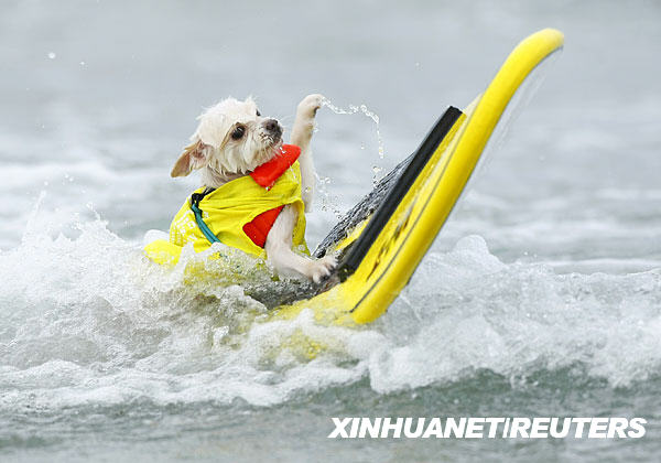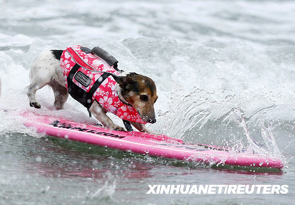 9月13日,在美國加利福尼亞州的德爾馬,一只8歲大的小狗體驗沖浪。當天,這里舉辦了一場狗狗沖浪大賽,旨在為流浪動物籌集善款并喚起人們對寵物的愛心和責任感。