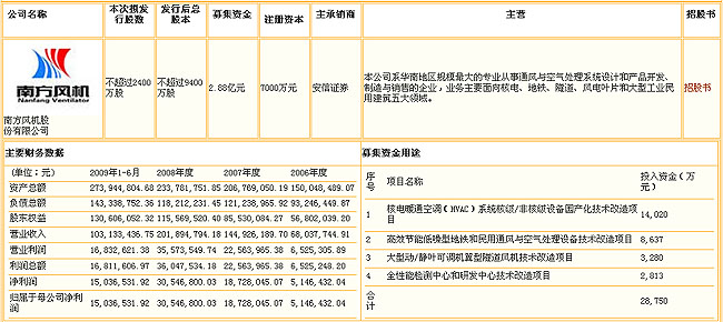 |   南方風(fēng)機(jī)系華南地區(qū)規(guī)模最大的專(zhuān)業(yè)從事通風(fēng)與空氣處理系統(tǒng)設(shè)計(jì)和產(chǎn)品開(kāi)發(fā)、制造與銷(xiāo)售的企業(yè),業(yè)務(wù)主要面向核電、地鐵、隧道、風(fēng)電葉片和大型工業(yè)民用建筑五大領(lǐng)域。南方風(fēng)機(jī)本次募集資金將用于四大項(xiàng)目的改造,分別是:核電暖通空調(diào)(HVAC)系統(tǒng)核級(jí)/非核級(jí)設(shè)備國(guó)產(chǎn)化技術(shù)改造項(xiàng)目、高效節(jié)能低噪型地鐵和民用通風(fēng)與空氣處理設(shè)備技術(shù)改造項(xiàng)目、大型動(dòng)/靜葉可調(diào)機(jī)翼型隧道風(fēng)機(jī)技術(shù)改造項(xiàng)目、全性能檢測(cè)中心和研發(fā)中心技術(shù)改造項(xiàng)目。