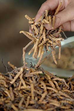 提起上世紀(jì)80年代初期在冬蟲夏草的主產(chǎn)區(qū)——青海省玉樹藏族自治州雜多縣收購蟲草的情景,中國科學(xué)院西北高原生物研究所研究員張曉峰記憶猶新:“當(dāng)時一次就收購了兩大卡車冬蟲夏草,差不多有10噸,價錢也相當(dāng)?shù)停阆聛硪还镆簿?0塊錢! 有關(guān)統(tǒng)計顯示,上世紀(jì)80年代初,冬蟲夏草一公斤的價格只有200元至300元?闪钊梭@詫的是,僅僅過了不到30年時間,冬蟲夏草就由過去“藏在深山人未知”的狀態(tài),迅速變?yōu)槿巳丝谥械摹败淈S金”,價格也一路攀升。 張曉峰長期關(guān)注冬蟲夏草的市場發(fā)展,他說,冬蟲夏草的價格是從上世紀(jì)80年代中期慢慢抬高的,真正抬高是在前幾年:東南亞一些保健意識強(qiáng)、經(jīng)濟(jì)發(fā)展?fàn)顩r好的國家利用冬蟲夏草來養(yǎng)身,使得蟲草價錢逐步提高。發(fā)展到2006年,蟲草的價格猛增到一公斤5萬元至16萬元;今年,如果在源頭收購,800條至1000條一公斤的最優(yōu)品價格已經(jīng)達(dá)到18萬元一公斤;比較受歡迎的1000條至1200條一公斤的中等蟲草價格也達(dá)12萬元。 迅速走高的價格和越來越熱的需求使得蟲草市場“繁榮”異常。走在青海省會西寧市的大街上,順次排開的蟲草專賣店一家接著一家。記者數(shù)了一下,僅在七一路上不到100米的距離內(nèi),就開了十多家蟲草專賣店。