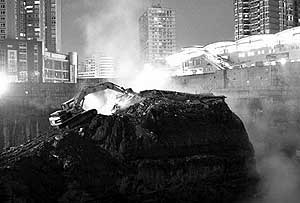 拆除工作進展得格外慢,這或許是因為現(xiàn)場沒有足夠強的光照。同時,“孤島”地形顯然對挖掘機的工作造成了一定麻煩。
