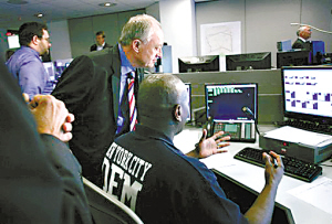 14日,倫敦市長(zhǎng)肯·利文斯通(右二)在參觀紐約的應(yīng)急事故處理系統(tǒng)。