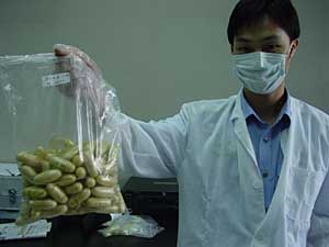 廣州白云機(jī)場(chǎng)海關(guān)關(guān)長(zhǎng)畢列佳介紹說(shuō),這些毒販攜帶的毒品海洛因外包裝都經(jīng)過(guò)機(jī)械化包裝和專(zhuān)業(yè)化處理,外形規(guī)則呈橄欖狀橢圓型,包裝緊密堅(jiān)硬,且耐腐蝕性非常強(qiáng),能在人體內(nèi)數(shù)日不會(huì)破損。并且根據(jù)不同人種的耐受力制造成每粒7克至15克不等的毒品。
