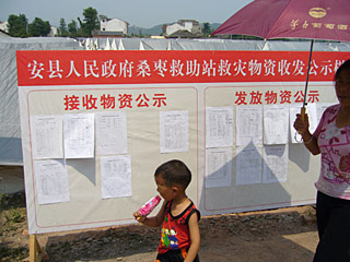 6月2日,都江堰市聚源鎮(zhèn)受災(zāi)群眾集中安置點(diǎn)。 這里與教學(xué)樓整體垮塌的聚源中學(xué)只有一河之隔。附近鎮(zhèn)上所有房屋成了危房或已坍塌的居民都臨時(shí)搬到這里。隔河望去,一排排藏青色的民政救災(zāi)帳篷整齊如軍營(yíng)。 正值中午時(shí)分,帳篷里的人多外出辦事了,守在帳篷內(nèi)的多是婦女和老人。一對(duì)年輕夫婦正推著嬰兒車(chē)準(zhǔn)備外出,一位上了歲數(shù)的大爺含一支煙袋,正外出遛鳥(niǎo)。帳篷中,人們的生活正以一種別樣的方式在繼續(xù)。 自阿壩州養(yǎng)路段退休的吳顯才與老伴袁桂華正在河邊的林蔭下休息,身旁還有孫子。他們都穿著企業(yè)捐贈(zèng)的短袖衫,手中各喝著一瓶農(nóng)夫山泉礦泉水。吳顯才說(shuō):“我們家的房子在鎮(zhèn)上街邊,120平方米的房子全塌了。屋里的東西搶出來(lái)一些,電視也不知壞沒(méi)壞! 盡管戶口不在這里,他們還是領(lǐng)到了瓶裝水和快餐面。一些外地來(lái)的志愿者還給分發(fā)了常備物資,如感冒藥、藿香正氣水、衣服等。說(shuō)著,他還指著自己穿的衣服說(shuō),上邊都標(biāo)有太極藿香液的字樣。據(jù)說(shuō),這家企業(yè)向?yàn)?zāi)區(qū)發(fā)放了10萬(wàn)件衣服,見(jiàn)人就發(fā)。 聚源鎮(zhèn)8大隊(duì)1小隊(duì)的村民楊中芳說(shuō),他是本地戶口,救災(zāi)物資只要來(lái)了,都有他們的份兒。家中發(fā)了夠10天吃的餅干,還有足夠喝的純凈水,20桶方便面。地震后的5天里,每天都會(huì)領(lǐng)到救災(zāi)用的食品和水,后來(lái)隔幾天發(fā)一次。 在聚源鎮(zhèn)集中安置點(diǎn),住在22號(hào)帳篷的李蓮剛泡了一包方便面,準(zhǔn)備吃午飯。她對(duì)記者說(shuō),他們現(xiàn)在3家人住在一個(gè)帳篷里,現(xiàn)在有幾千人住在這個(gè)安置點(diǎn)。記者看到,帳篷內(nèi)有成堆的救災(zāi)物資,有成箱的礦泉水、方便面、牛奶等。在靠近門(mén)口的一角,還堆著大米等成袋物資。李蓮說(shuō):“平時(shí)主要吃稀飯、餅干和方便面,也上街買(mǎi)菜,菜價(jià)與平時(shí)一個(gè)樣,只是魚(yú)價(jià)漲了! 6月5日,在綿陽(yáng)市安縣睢水鎮(zhèn)幼兒園,正趕上鎮(zhèn)領(lǐng)導(dǎo)一班人在一個(gè)救災(zāi)帳篷內(nèi)研究工作。他們正在傳達(dá)一份“特急”文件,要求救災(zāi)物資的管理臺(tái)賬一定要建立起來(lái),各鄉(xiāng)鎮(zhèn)每個(gè)部門(mén)、村民委員會(huì)都要建立公示救災(zāi)物資發(fā)放制度,接受社會(huì)監(jiān)督。 對(duì)于救災(zāi)物資登記發(fā)放工作,睢水鎮(zhèn)黨委書(shū)記馮德強(qiáng)說(shuō):“最開(kāi)始,特別是震后前幾天,物資來(lái)源復(fù)雜。我們更多是做好災(zāi)民的安置,讓受災(zāi)群眾有東西吃,有地方住,有水和藥品。由于人手少,物資管理有些亂! 馮德強(qiáng)說(shuō),但5月17日后,物資管理關(guān)口開(kāi)始把嚴(yán)了,大宗物品均有村里簽字。救災(zāi)物資都是現(xiàn)場(chǎng)統(tǒng)一配給,鄉(xiāng)鎮(zhèn)直接到發(fā)放點(diǎn)領(lǐng)取,各個(gè)村從鄉(xiāng)里領(lǐng),小組再到村里領(lǐng)。其中,像帳篷、膠布、被子等容易清點(diǎn)的大宗物資把得很?chē)?yán),但像方便面等一些不好清點(diǎn)的物資,百姓不可能等著你清理好再領(lǐng),所以具體數(shù)量上有些亂。 現(xiàn)在,全鎮(zhèn)6000來(lái)戶家庭,大概領(lǐng)到900多頂帳篷,都發(fā)放下去了,重點(diǎn)是解決山上受災(zāi)最重的群眾。目前,帳篷缺口在1000頂左右。 6月5日,記者來(lái)到安縣桑棗救助站,這里臨時(shí)居住著2000多名受災(zāi)群眾。來(lái)自安縣茶坪鄉(xiāng)的劉剛說(shuō),他們一個(gè)帳篷內(nèi)住了3家14個(gè)人,平時(shí)吃免費(fèi)食堂,一般兩個(gè)素菜,偶爾還有肉吃,大米管夠。 民政部6月1日頒布了《汶川地震抗震救災(zāi)生活類(lèi)物資分配辦法》,規(guī)定物資發(fā)放點(diǎn)要吸收受災(zāi)群眾推選的代表參與生活類(lèi)物資的發(fā)放和管理工作,實(shí)行收發(fā)“實(shí)名制”。記者看到,在桑棗救助站內(nèi),已設(shè)有專(zhuān)門(mén)的接收發(fā)放救災(zāi)物資公示欄,上面清楚地登記著有受災(zāi)群眾簽字的領(lǐng)取物資明細(xì)。