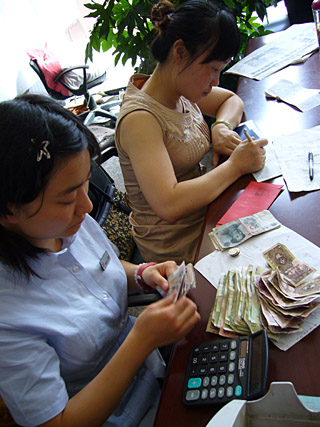 | 6月1日,四川省民政廳現(xiàn)金捐贈(zèng)處。四川省工商銀行營(yíng)業(yè)部城南支行工作人員李燕和楊爭(zhēng)在辦理著來(lái)自社會(huì)各界人士的捐款接收手續(xù)。 | 接收入賬,記好每一筆愛(ài)心捐款