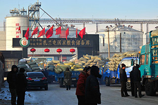 | 2月3日,滿載糧食的車輛在內(nèi)蒙古扎蘭屯國家糧食儲備庫門口排起長隊(duì)。新華社發(fā)(王澤蔚