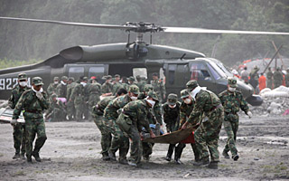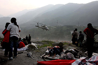 | 5月15日,映秀鎮(zhèn)的受傷群眾在等待著解放軍直升機(jī)的營救。 |