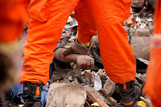 綿竹市漢旺鎮(zhèn),距離汶川地震震中直線距離約30公里,災(zāi)情十分嚴(yán)重,海軍陸戰(zhàn)隊(duì)2750多名官兵于16日凌晨4時(shí)趕到漢旺鎮(zhèn)后,立即展開救援行動(dòng)。我得到消息后,馬上以最快的速度走出映秀鎮(zhèn),經(jīng)成都轉(zhuǎn)戰(zhàn)漢旺災(zāi)區(qū)。 17日下午,我終于趕到漢旺鎮(zhèn)東汽中學(xué)救援現(xiàn)場,陸戰(zhàn)隊(duì)官兵已經(jīng)在這里奮戰(zhàn)多時(shí),一邊配合消防隊(duì)的救援挖掘機(jī)清理廢墟,一邊繼續(xù)尋找遇難學(xué)生的遺體。 在現(xiàn)場的陸戰(zhàn)隊(duì)員告訴我說,大地震造成漢旺東方汽輪機(jī)廠的東汽中學(xué)和東汽技校倒塌,中學(xué)受災(zāi)最為嚴(yán)重,至少有300多名中學(xué)生被埋在倒塌的瓦礫中。再就是漢旺煤礦的宿舍樓全部被毀,倒班休息的礦工們也沒有逃離厄運(yùn)。 據(jù)資料顯示,漢旺曾是個(gè)美麗富饒的地方,是全國首批57個(gè)綜合改革試點(diǎn)鎮(zhèn)之一,全國500家小城鎮(zhèn)試點(diǎn)鎮(zhèn),全國生態(tài)環(huán)境及基礎(chǔ)設(shè)施建設(shè)試點(diǎn)鎮(zhèn),2001年榮獲全國創(chuàng)建文明城鎮(zhèn)示范點(diǎn)的光榮稱號(hào)。 可是,出現(xiàn)在我眼前的漢旺,卻是一片倒塌的廢墟,這里的人們已經(jīng)失去了自己美好的家園。漢旺鎮(zhèn)約有60余座高層建筑,強(qiáng)震后幾乎沒有一座建筑完好。據(jù)說,地震發(fā)生時(shí),漢旺鎮(zhèn)政府的領(lǐng)導(dǎo)正在開會(huì),一名副鎮(zhèn)長由于遲到了5分鐘,僥幸活了下來,其他班子成員全都被掩埋在鎮(zhèn)政府大樓的廢墟里。當(dāng)時(shí),東方汽輪機(jī)廠車間里有上千名工人在上班,地震時(shí)廠房倒塌也都被壓在廢墟里。 在東汽中學(xué),我目睹了救援人員尋找遇難學(xué)生遺體的悲壯場面。當(dāng)一具具變形的遺體被從廢墟里抬出時(shí),我明顯地感覺到現(xiàn)場的空氣在悲傷中凝固,令人窒息。盡管人們都戴著口罩,還是能夠聞到濃烈的氣味,非常難聞。 在漢旺鎮(zhèn)小學(xué)的操場上,擺放著幾十具剛剛挖出來的學(xué)生遺體,檢疫人員在進(jìn)行逐一登記,家長們要在這里認(rèn)領(lǐng)自己的孩子。這是個(gè)多么觸目驚心的場面!當(dāng)家長們看到自己模糊不清的親生骨肉時(shí),難以自禁地迸發(fā)出撕心裂肺的哭泣。面對此情此景,我淚流滿面,不忍心按下手中相機(jī)的快門。